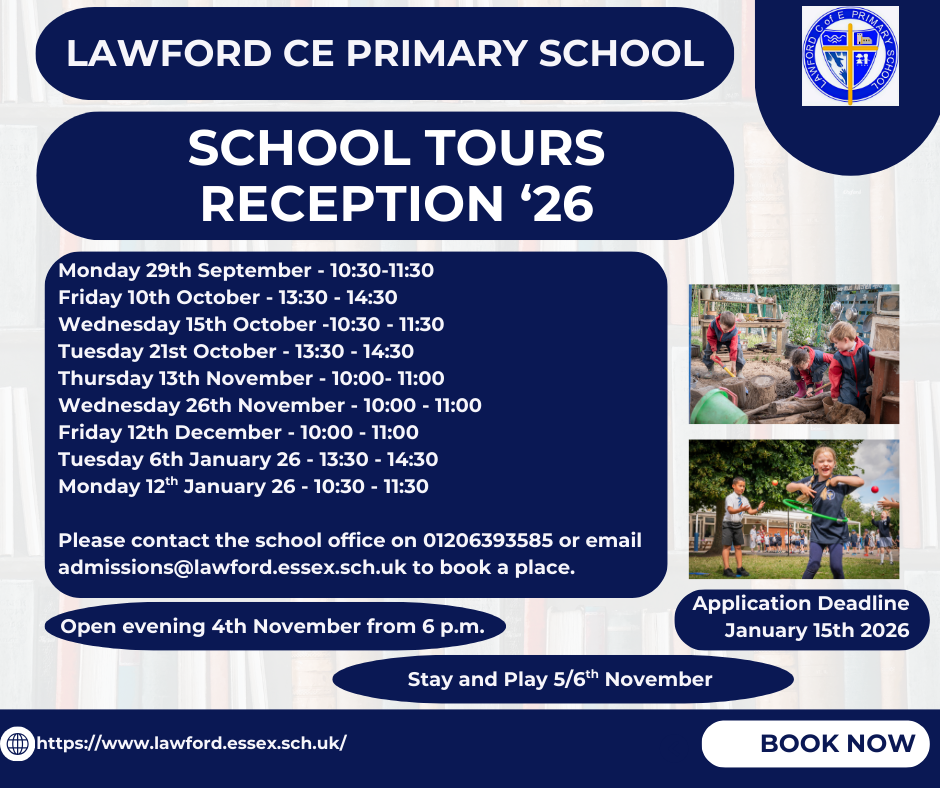 Please contact the school office on 01206393585 or email admissions@lawford.essex.sch.uk to book a place. If you are unable to make any of these dates, we will try and accommodate you at another time, possibly after school hours.
